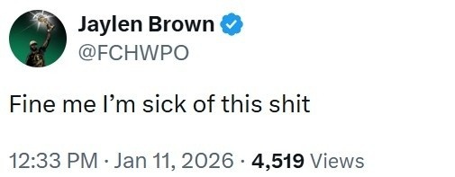 杰伦·布朗还更推喊话道:“罚我款吧,我早就受够了这些破事。”